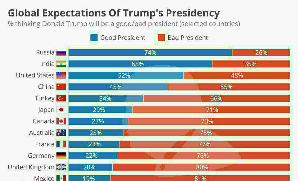 آن داشته است آماری از محبوبیت او بگیرند. مرکز گلوبال در آماری که ارائه داده، اعلام کرده ترامپ در کشور خود فقط 52 در صد محبوبیت دارد.