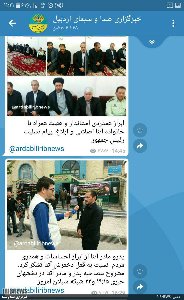 در عین حال کانال تلگرامی خبرگزاری صدا و سیمای اردبیل نیز تمامی این گزارش ها را برای آگاهی مردم بارگزاری کرد و در این مدت به مرجع مطمئن برای دسترسی به اخبار موثق درباره آتنا تبدیل شده بود.