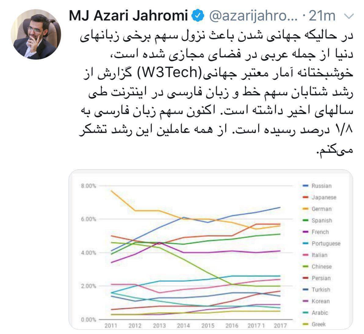 به گزارش سرویس فضای مجازی خبرگزاری صدا و سیما ، "آذری جهرمی" وزیر ارتباطات و فناوری اطلاعات در صفحه توییتر خود از افزایش سهم خط فارسی و زبان فارسی در اینترنت خبر داد و از همه دست اندارکاران این رشد تشکر کرد .