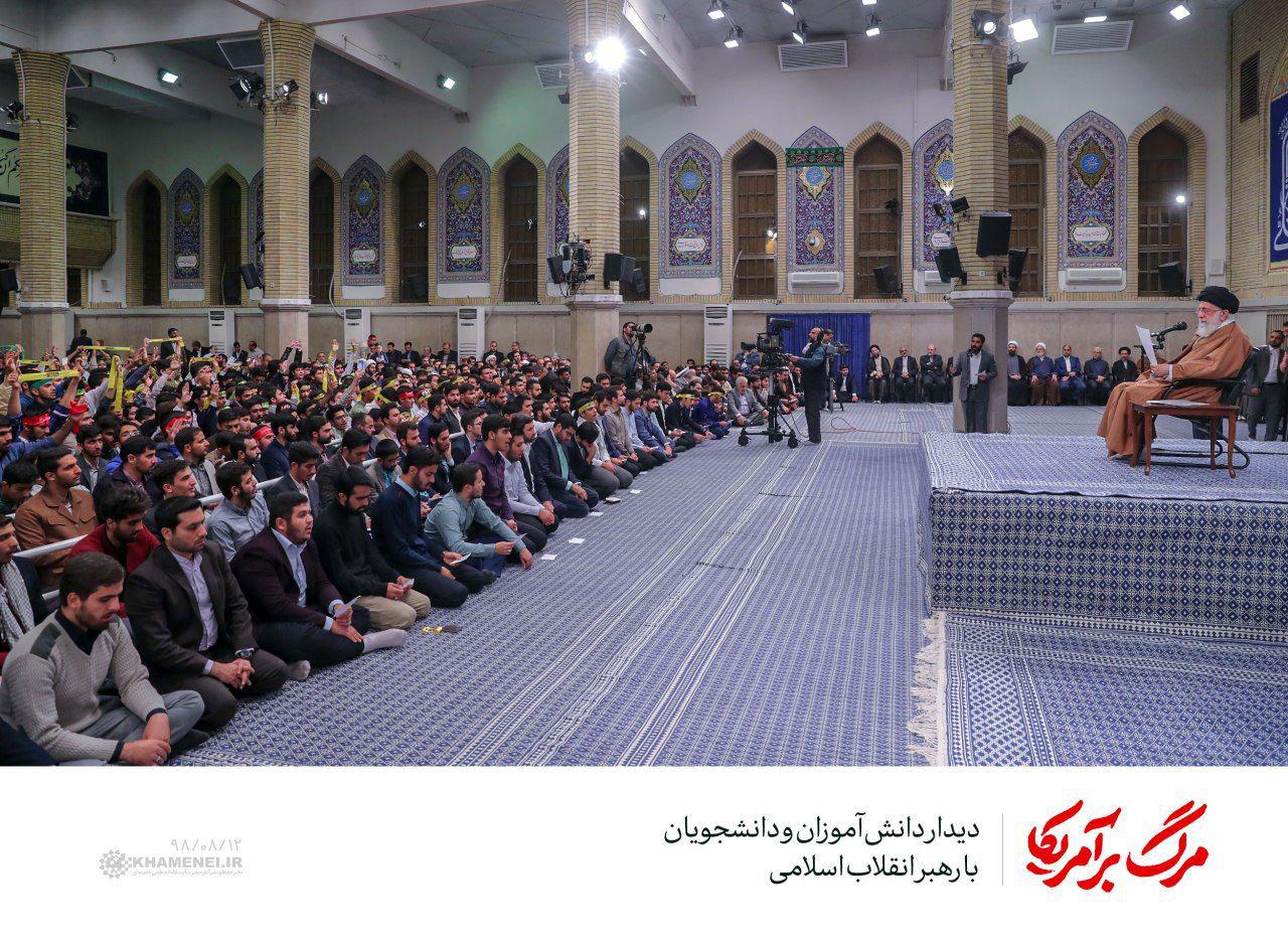 به گزارش خبرگزاری صدا و سیما به نقل از پایگاه اطلاع رسانی دفتر مقام معظم رهبری، حضرت آیت الله خامنه‌ای رهبر معظم انقلاب اسلامی صبح امروز (یکشنبه) و در آستانه ۱۳ آبان روز ملی مبارزه با استکبار جهانی در دیدار هزاران نفر از دانش آموزان و دانشجویان سراسر کشور، نسل جوان پرتوان، پر نشاط و پر انگیزه را نعمتی بزرگ و ذخیره‌ای ارزشمند برای ایران خواندند و با اشاره به استمرار خصومت عمیق آمریکا با ملت ایران از کودتای ۱۳۳۲ تاکنون تأکید کردند: آمریکای گرگ‌صفت البته ضعیف‌تر، اما وحشی‌تر و وقیح‌تر شده است و در مقابل، جمهوری اسلامی ایران با دفاع مقتدرانه و منع مستدل مذاکره، راه نفوذ و ورود مجدد آمریکا به کشور را سد کرده است.