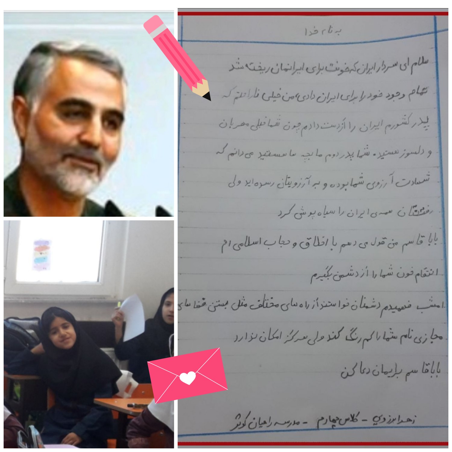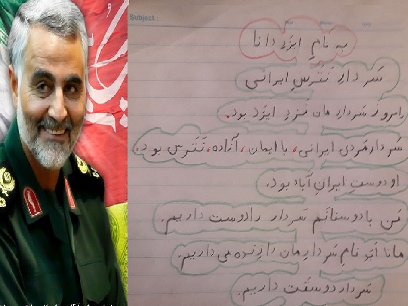 دلنوشته های دانش آموزان کلاس اول بجنورد برای سردار شهید"حاج قاسم سلیمانی" به ما می گوید خردسالانی هم که جنگ و تکفیر و داعش و ترور را مستقیما درک نکرده اند، در ملاحت لبخند و دستان به دعابرداشته این سردار که این روزها بارها در تلویزیون پخش می شود، عظمت شخصیت یک انسان خالص را درک کرده اند و به او می بالند.