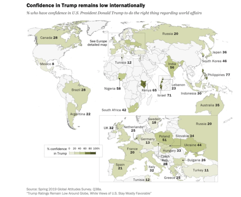 در همه کشورهایی که این نظرسنجی صورت گرفت، ترامپ نسبت به باراک اوباما رئیس جمهور قبل از خود، رتبه پایین تری از نظر اعتماد عمومی به سیاست هایش کسب کرد. در این نظرسنجی که در بهار و تابستان ۲۰۱۹ صورت گرفت، مشخص شد ۶۸ درصد مردم در کشورهای مختلف جهان عملکرد رئیس جمهور آمریکا را در افزایش تعرفهها بر کالاهای وارداتی رد میکنند؛ ۶۶ درصد مخالف خروج دولت ترامپ از توافقات اقلیمی بین المللی هستند؛ و ۶۰ درصد با پیشنهاد ترامپ برای احداث دیوار در مرز مکزیک مخالفند.