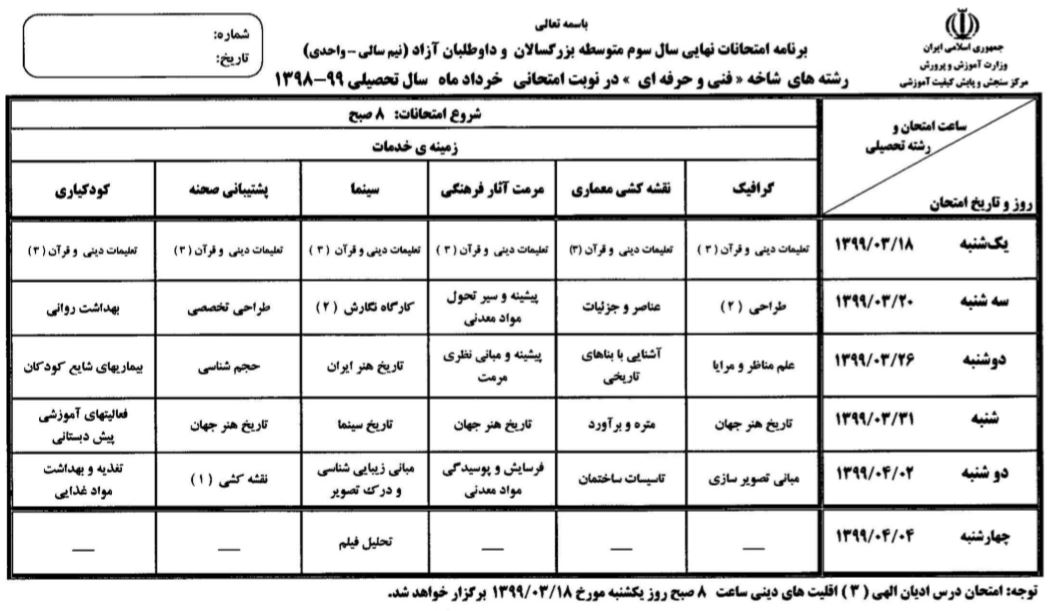 اعلام برنامه امتحانات نهایی همه رشتههای تحصیلی