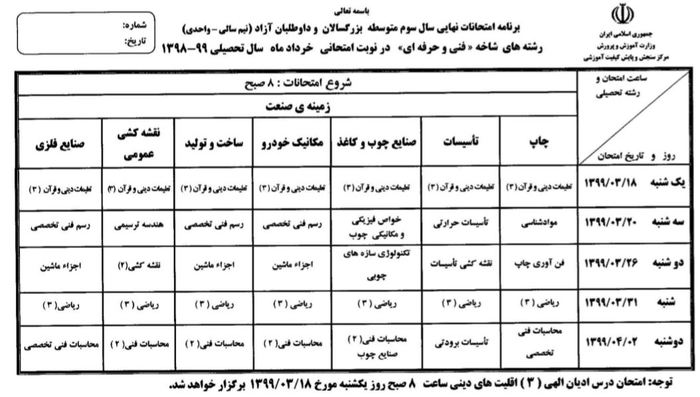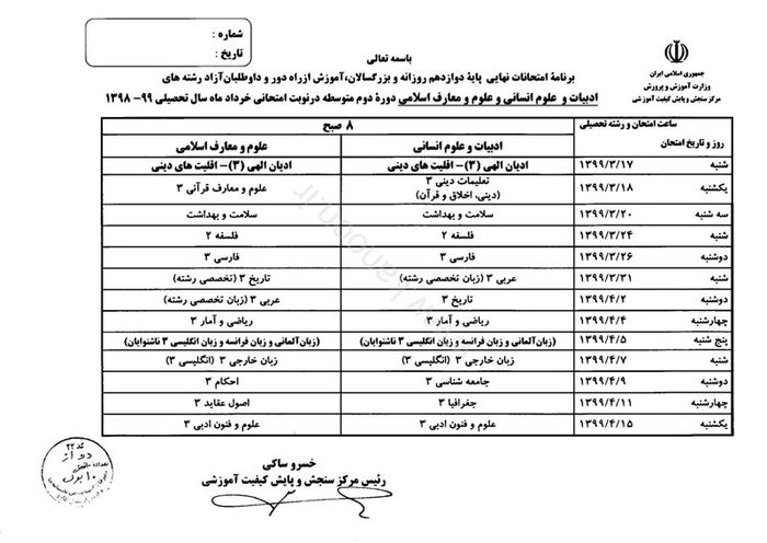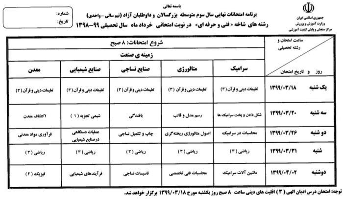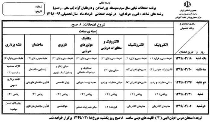 خبرگزاری صدا و سیما مرکز مازندران ، مرکز اطلاع رسانی و روابط عمومی وزارت آموزش و پرورش اعلام کرد ، مرکز سنجش برنامه امتحانات نهایی همه رشتههای تحصیلی دورههای متوسطه (نظری، فنی و حرفهای) ، پیشدانشگاهی و پایه دوازدهم دوره دوم متوسطه در خرداد ماه سال تحصیلی ۹۹ – ۱۳۹۸ را به شرح زیر اعلام کرد: