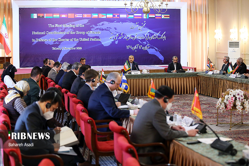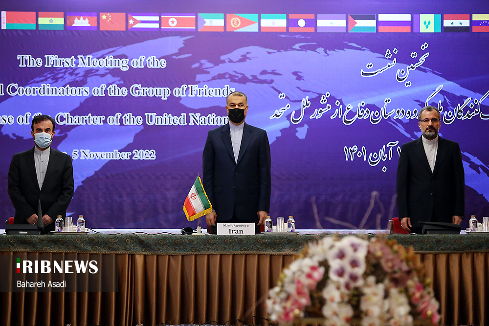 نخستین نشست هماهنگ کنندگان ملی گروه دوستان دفاع از منشور ملل متحد، امروز شنبه ۱۴ آبانماه با سخنرانی افتتاحیه حسین امیرعبداللهیان وزیر امور خارجه در محل دفتر مطالعات سیاسی و بینالمللی وزارت امور خارجه برگزار شد. گروه دوستان منشور ملل متحد در سال ۲۰۲۱ با هدف حفظ، ارتقاء و دفاع از تفوق و اعتبار منشور سازمان ملل با مشارکت ۱۹ کشور تشکیل شداعضای این گروه شامل جمهوری اسلامی ایران، الجزایر، آنگولا، بلاروس، بولیوی، کامبوج، چین، کوبا، کره شمالی، گینه استوائی، اریتره، لائوس، نیکاراگوئه، دولت فلسطین، روسیه، سنت وینسنت و گرنادینز، سوریه، ونزوئلا و زیمبابوه هستند