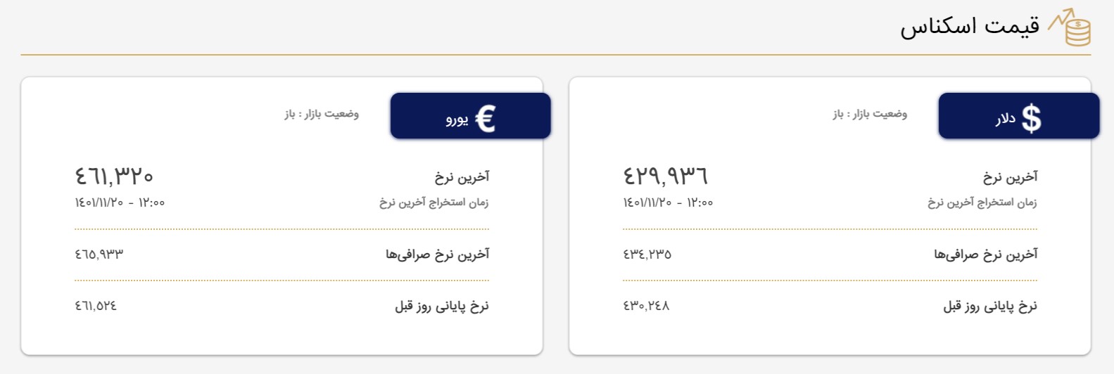 طبق اعلام بانک مرکزی، از روز ۱۴۰۱/۱۱/۰۴ کلیه صرافیها مجازند نسبت به فروش ارز به صورت اسکناس با نرخ منتشرشده تحت عنوان "آخرین نرخ صرافیها" در سایت مدیریت بازار متشکل معاملات ارز ایران به آدرس www.ice.ir اقدام نمایند.