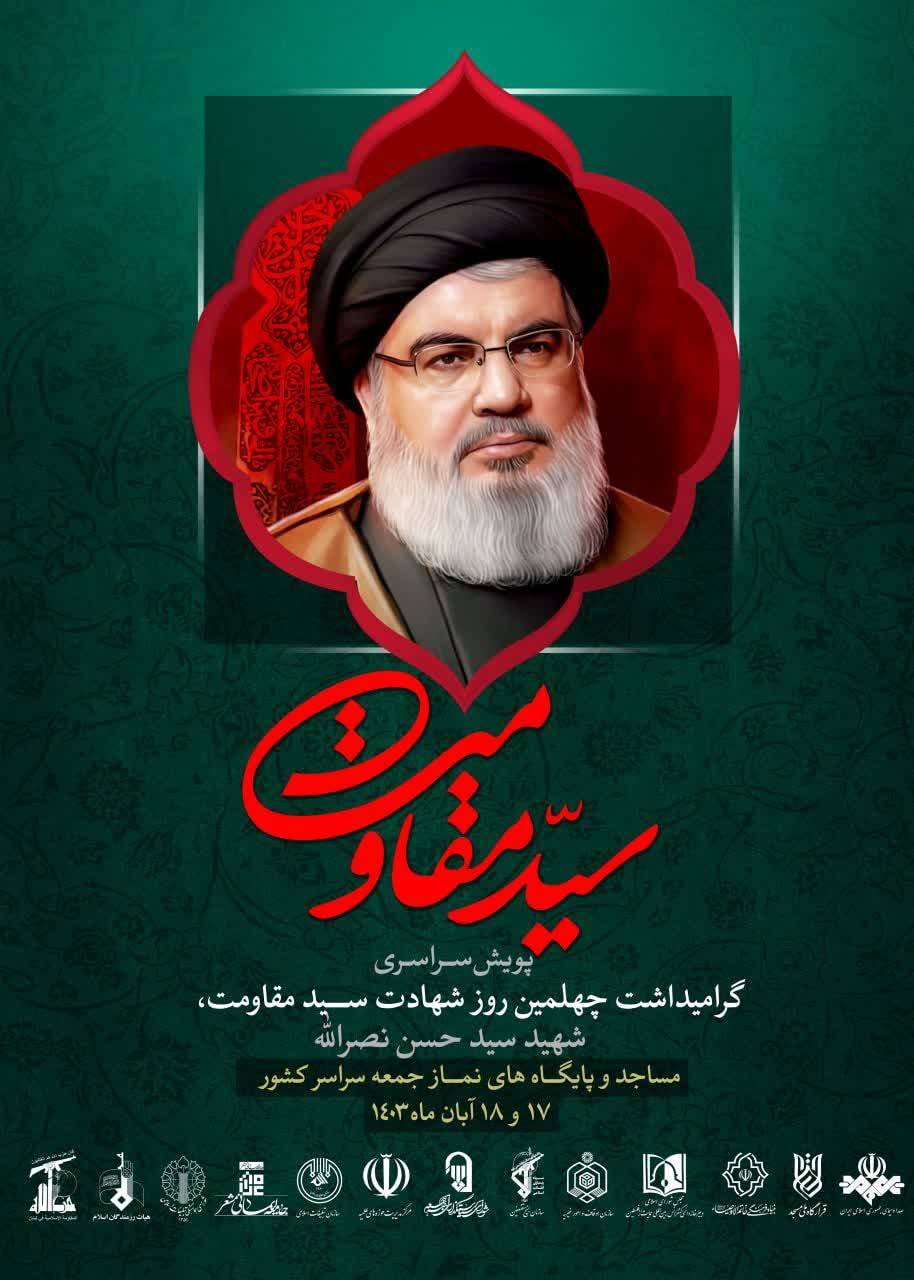 به گزارش خبرنگار خبرگزاری صدا و سیما، حجت الاسلام نوری، سخنگوی شورای سیاستگذاری ائمه جمعه در گفتگو با خبرنگار ما گفت: در چهلمین روز شهادت سید مقاومت، شهید سید حسن نصرالله که مقارن با ۱۷ و ۱۸ آبان است، ویژه برنامه بزرگداشت اربعین سید مقاومت، پنج شنبه و جمعه در مساجد سراسر کشور و نمازهای جمعه تدارک دیده شده است.