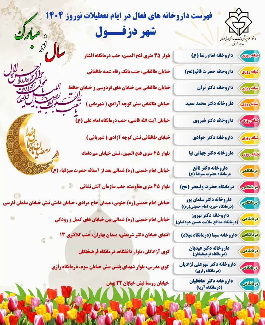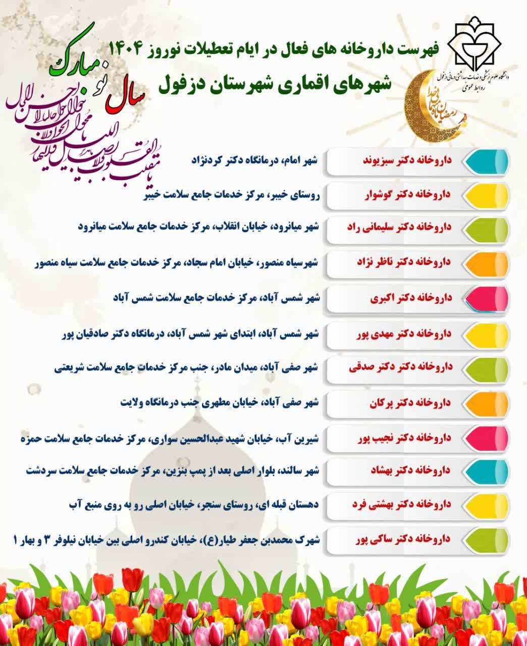 به گزارش خبرگزاری صدا و سیمای استان خوزستان، به نقل از روابط عمومی معاونت غذا و دارو دانشگاه علوم پزشکی دزفول؛ اسامی داروخانه‌های فعال در این شهرستان و شهر‌های اقماری آن در تعطیلات نوروزی به شرح زیر است: