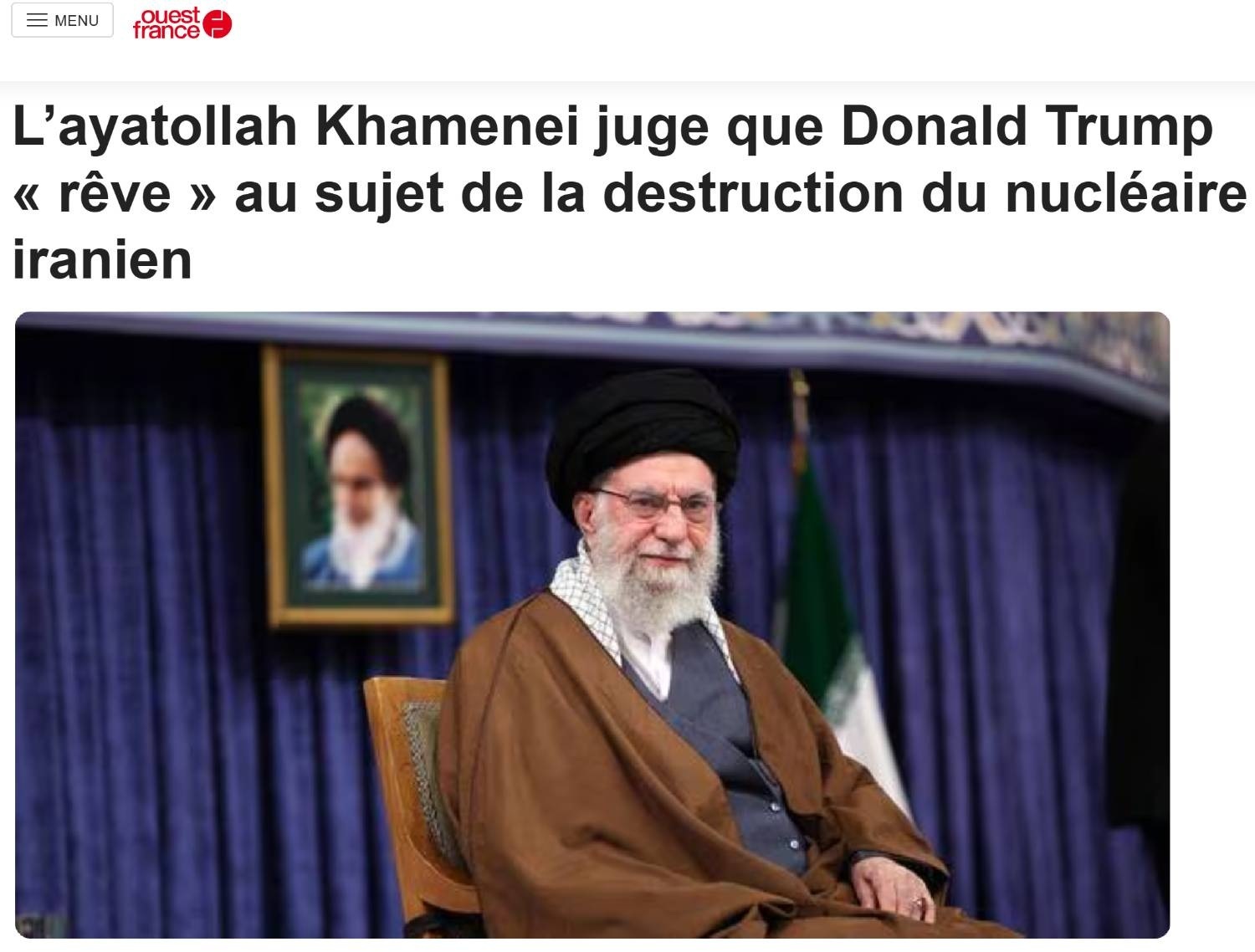 وست فرانس - آیه الله خامنه‌ای رهبر معظم ایران گفته دونالد ترامپ درباره نابودی مراکز هسته‌ای ایران در خواب و خیال است.